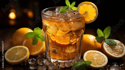 Refreshing Summer Beverage with Ice, Lemon Slices, and Fresh Mint Leaves Surrounded by Juicy Oranges on a Dark Background