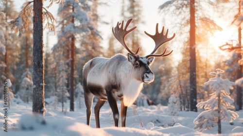 Reindeer at snow forrest background. Animal and nature concept. Generative ai.