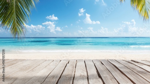 Relax on a wooden deck with a breathtaking view of a tropical beach featuring turquoise waters and soft white sand under a bright blue sky