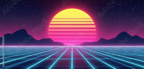 Retro futuristic landscape with neon grid lines. 80s synthwave style. Vibrant colors, techy design. Night scene with glowing sun. Mountains in background. Digital urban aesthetic. Cyberpunk style.
