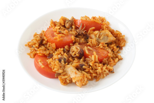 rice, seafood, squid, lemon, boiled, fish, food, meal, dinner, lunch, onion, plate, white, traditional, mediterranean, paella, sea, spice, nobody, isolated