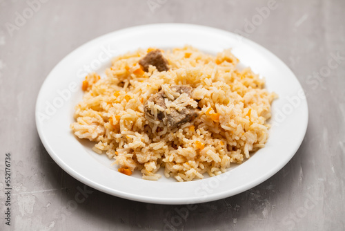 Rice with vegetables and meat on white plate