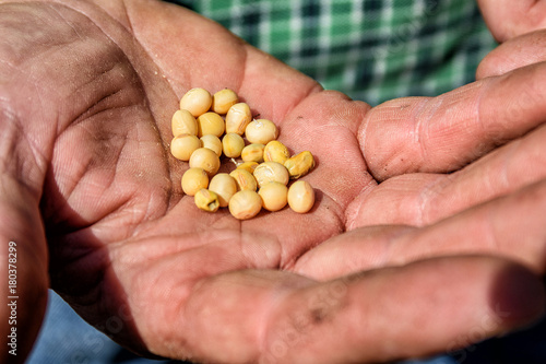 Ripe soybeans in a family farmer's hand