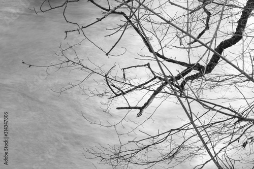 River flowing fast and leafless tree branch of winter season.