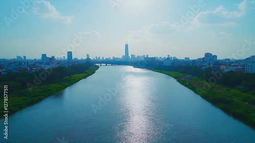 river, city, skyline, city landscape, sunny, day, vietnam, asia, landscape, urban, building, architecture, modern, panoramic, aerial, view, waterfront, travel, tour tourism, vacation, photo, image, background, nature, environment, riverfront, scenery, photo, beautiful, scenic, water, cloud, skyscraper, river bank, panorama