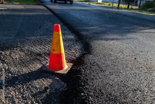 Roadwork detail, colorful safety cone sitting by the new tarmac