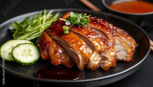 duck, roasted, cookery, asian, food, meal, dinner, pork meat, chicken, meat, sauce, dish, slice, delicious, healthy, receipe, protein, easy, crispy, tender, savoury, vegetable, cucumber, ginger, soy, sesame, garlic, plating, eatery
