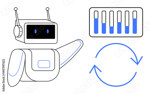 Robot analyzing progress bars, robotic arm raised in motion, process loop visualization. Ideal for AI, robotics, automation, machine learning, data processing, technology simple landing page