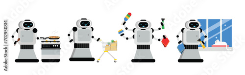 robot, housework, doing, cleaning, housekeeping, set, funny, android, assistant, cleanup, chore, domestic, machine, illustration, home, futuristic, character, household, artificial, cooking, assistance, shopping, cart, duty, dust, rub, window, intelligence, routine, technology, wipe, robotic, servant, helper, multitask, electronic, metal, tied-up, everyday, work, innovation, job, service, ai, cyborg, android, iron, isolated, art, vector