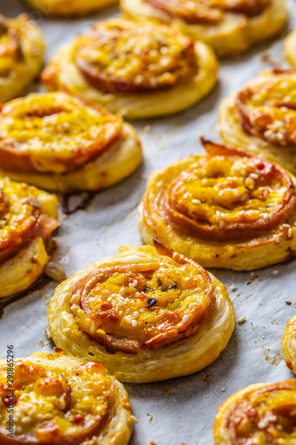 Rolls of puff pastry with ham bacon cheese sesame on baking tray