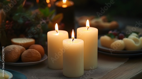 candlelight, candle, dinner, table, romantic, food, warm, cosy, ambience, evening, night, lit, burning, flames, light, soft, glow, illuminated, setting, scene, table setting, food and drink, delicious, dessert, fruit, bread, pastry, wooden table, rustic, elegant, intimate, gathering, special occasion, celebration, relaxing, peaceful, calm, warm light, tabletop