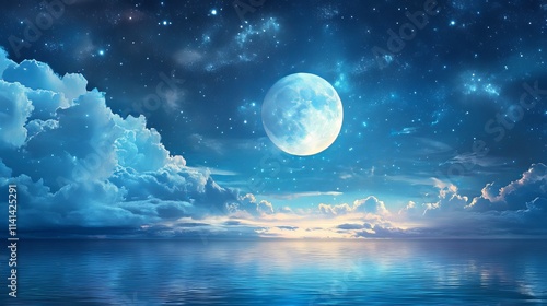 Romantic full moon illuminating starry sky with clouds reflecting on sparkling blue water