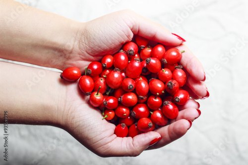 Rose hips in woman hands - body part