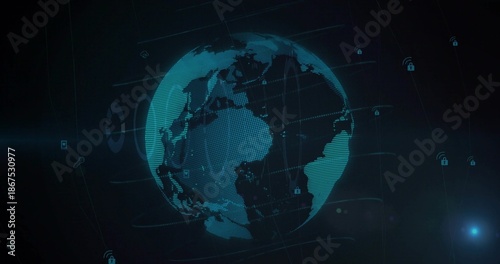 Rotating digital Earth globe showing dotted mesh gridlines in virtual dashboard, padlock icons