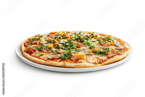 pizza, round, bacon, cheese, topping, garnish, herb, food, meal, italian, cookery, delicious, tasty, savoury, hot, ready, plate, white, isolated, photo, image, fresh, baked, cooked, deliciously, homemade, eatery, dinner, lunch, pork meat, vegetable