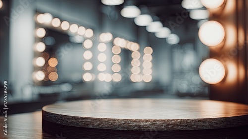 round, wooden, table, salon, interior, blurred, lighting, bokeh, make-up, mirror, spotlight, dark, grey, brown, light, warm, product, display, empty, modern, cosmetic, beauty, professional, hair, style, sharpened, background, design, tabletop, surface, light bulb, illumination, space, elegant, chic, furniture, decor, show, studio, booth