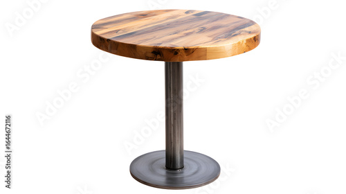 Round wooden table with metal base, furniture for dining or display on transparent background