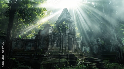 Ruin of ancient temple in deep tropical rainforest.