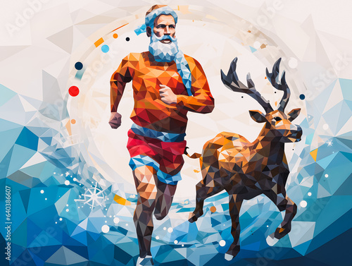 Running modern Santa Claus, with geometric reindeers in the background. Christmas shopping time. Generative AI