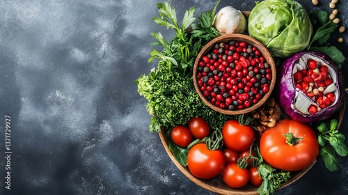 Rustic assortment of fresh vegetables on a textured dark background