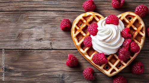 Rustic heart waffle close-up, topped with creamy swirl and raspberries, set on a weathered wooden background, warm and natural atmosphere