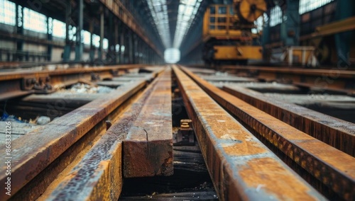 railway, track, industrial, rust, metal, perspective, factory, blue, structure, iron, construction, symmetry, urban, transportation, machinery, steel, decay, old, warehouse, repair, vintage, infrastructure, engineering, rust-eaten, line, equipment, work, depot, industry, mechanical, yellow, architecture, corridor, journey, rail, background, design, detail, horizontal