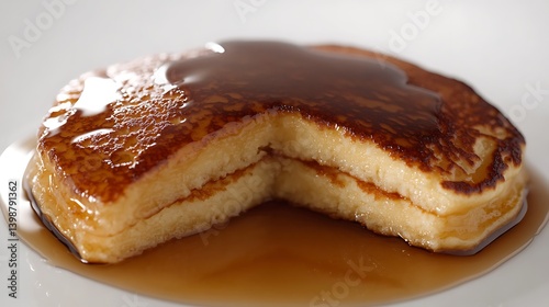 Rustic-style pancakes with a soft fluffy interior, coated in thick syrup that glistens under natural lighting on a pure white background.