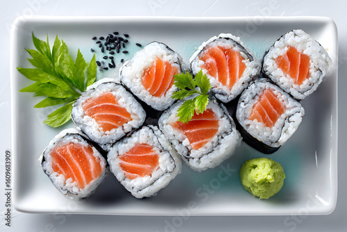 Salmon maki sushi roll, Cut into bite-sized pieces placed on plate. Japanese healthy Asian cuisine concept.