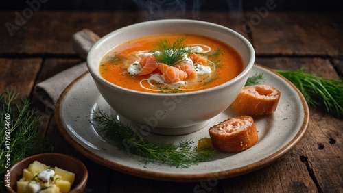 salmon, soup, warm, inviting, rustic, orange, garnished, smoked, cream, dill, bread, toasted, comfort, hearty, culinary, farmhouse, receipe, epicure, freshness, vibrant, texture, light, cosy, autumn, meal, savoury, tradition, home cooking, nourishing, favor, simplicity, artisanal, photo, food, plating, festive, celebration, harvest, tasteful, modern, elegant, design