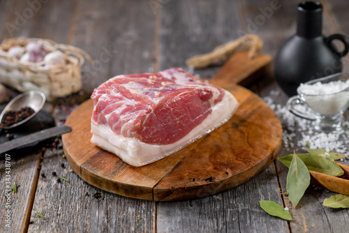 Salted brisket with spices on wooden board with garlic pepper jar wooden