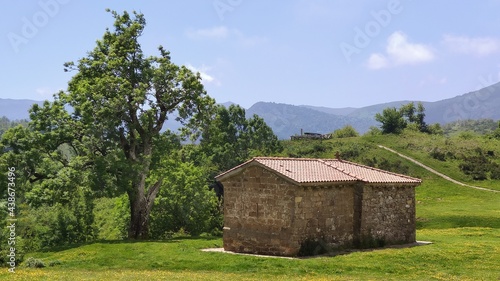 tradition, natural park, spain, tour tourism, scenery, construction, background, rural, europa, park, architecture, stone, countryside, ancient, travel, asturias, beautiful, mountain, typical, view, sanctuary, old, chapels, outdoors, sky, landscape, nature, historical building, landmark, history, religion, famous, historic, cross, green, vale, facades, flora, roof