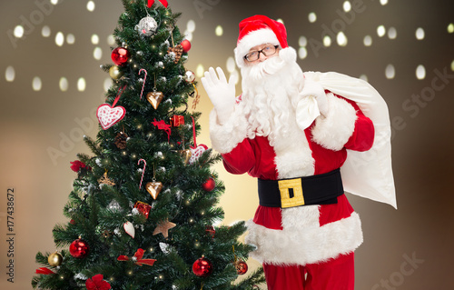 santa claus with bag and christmas tree