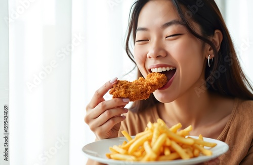Satisfied Asian woman enjoys crispy fried chicken, golden french fries. Close-up portrait shows happiness eating unhealthy fast food with bright smile. Isolated on white, image conveys pure