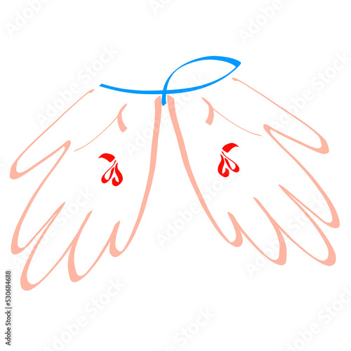 Savior's pierced palms with heart-shaped blood drops and ichthyus