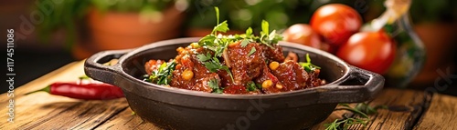 Savory Stew in Cast Iron Pot with Fresh Vegetables and Herbs on Rustic Wooden Table
