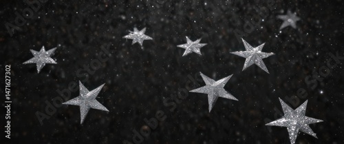 Scattered silver glitter stars on black, twinkling festive design, winter, background, shiny