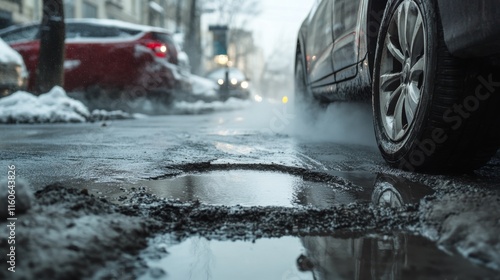 scene, car, leaking, radiator, tied-up, street, driver, looking, worried, highlighting, wants, regular, coolant, check, vehicle, maintenance, guide, view, puddle