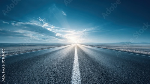 Scenic Highway Landscape with Asphalt Road Leading to Horizon, Under a Bright Sky and Sunlight