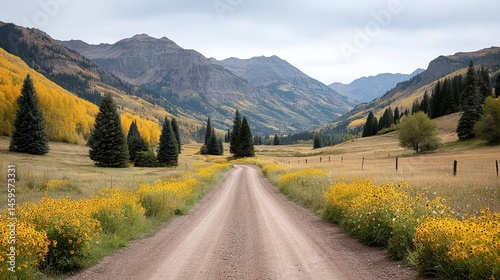 road, mountain, landscape, nature, scenery, tree, yellow flower, sky, peaceful, calmness, wilderness, national park, travel, adventure, countryside, colourful, horizon, picturesque, exploration, trail, foliage, seasonal, vibrant, rural, environment, weather, hill, grass, plant, vegetation, beautiful, cloud, serene, wildlife, forest, bright, remote, winding, sunlight, scenic view, natural beauty, solitude, elevation, panoramic