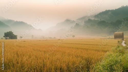 Scenic rice field with haystack and mountains shrouded in morning mist, seasonal change