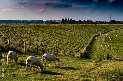 holland, sea, holland, north sea, sheep, meadow, green, heaven, horizon, fence, meadow, animal, nature, countryside