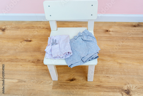 School supplies, clothes in children girl room on white wood chair. Mom/parents preparing outfit for daughter to wear on their first day of preschool.