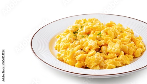 Scrambled eggs are made from chicken eggs. stirred, whipped, or beaten together typically with salt, butter, oil, pepper, and heated so that they form into curds. Isolated on white with copy space