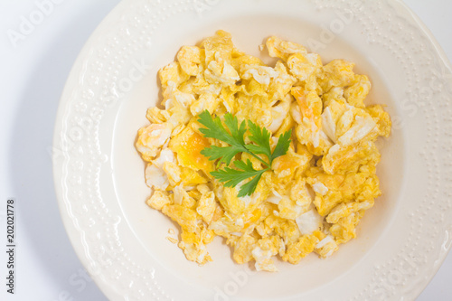 background, breakfast, brown, cholesterol, court, decoration, disc, egg, egg, food, fork, isolated, meal, omelet, piquant, plate, roast, scrambled, toasted, top, view, white, yellow