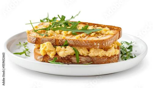 Scrambled Eggs Sandwiches on white plate isolated on white background, healthy keto breakfast. Whole grain toasts with scramble eggs and organic arugula microgreens, design element