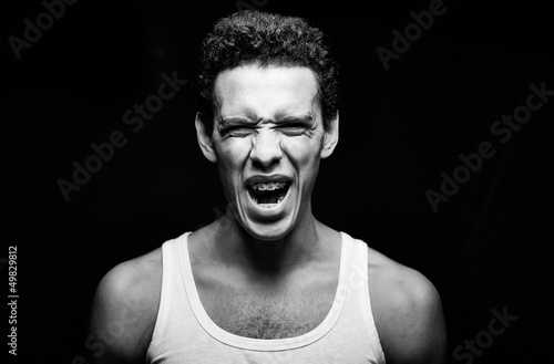 scream, people, man, male, guy, lad, fellow, white, contemporary, young, adult, lifestyle, caucasian, portrait, photogenic, masculine, 1, single, style, wearing, latino, cool, human, modern, model, posing, attractive, expression, emotion, vest, isolated, isolation, black-and-white, closeup, face, pose, black, background, macho, alone, shouting, screaming, agony, mouth, fear, rage, anger, frantic