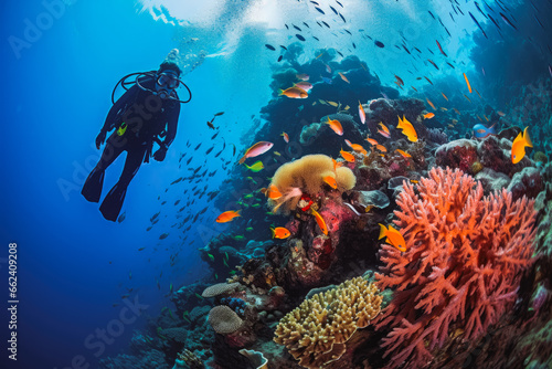 Scuba diving in tropical ocean coral reef sea under water. Scuba diver watching coral reef in clear turquoise waters, looking at fish.