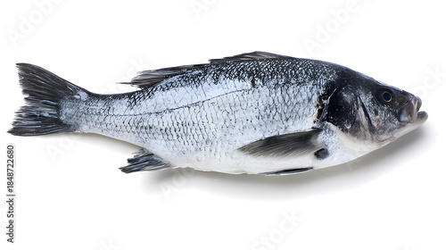 seabass. A fresh sea bass showcased on a clean white background, its detailed scales and texture captured under professional studio lighting. menu design.