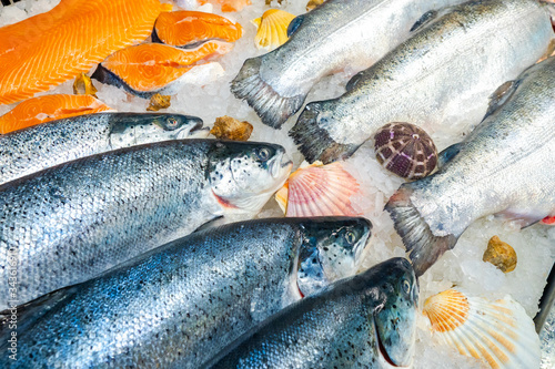 Seafood on ice. Fish shop window. Sale of freshly caught seafood. Gifts of the sea. Healthy food. Fish, mussels, oysters, and scallops. Cooking fish dishes.