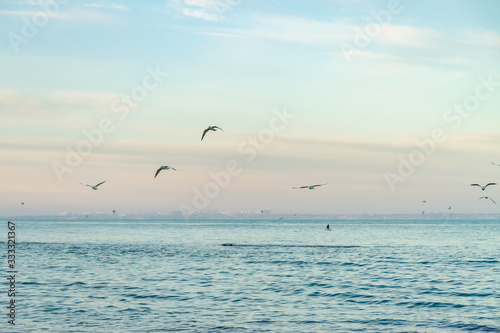 seagulls fly over the sea sunny weather